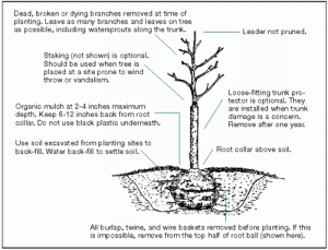 Mulch: Check around the base of the tree. If there is no mulch, add a thin layer of mulch (leaves, wood chips, or other mulch from your local retail nursery) to protect the tree and reduce evaporation. Do not “volcano” the mulch into a pile around the base, this will encourage rotting at the base of the tree.